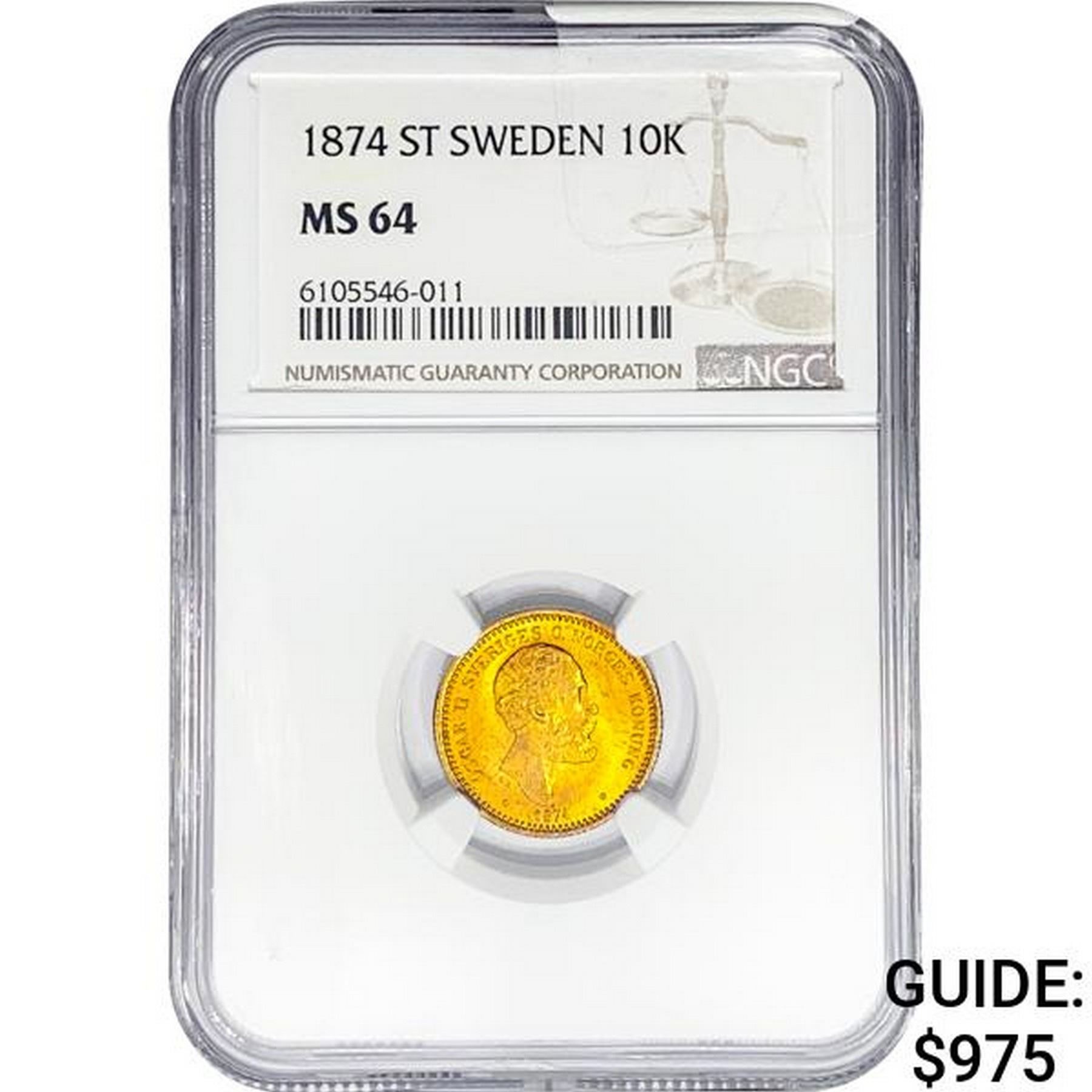 1874 .1296oz. Gold ST Sweden 10 Kroner NGC MS64