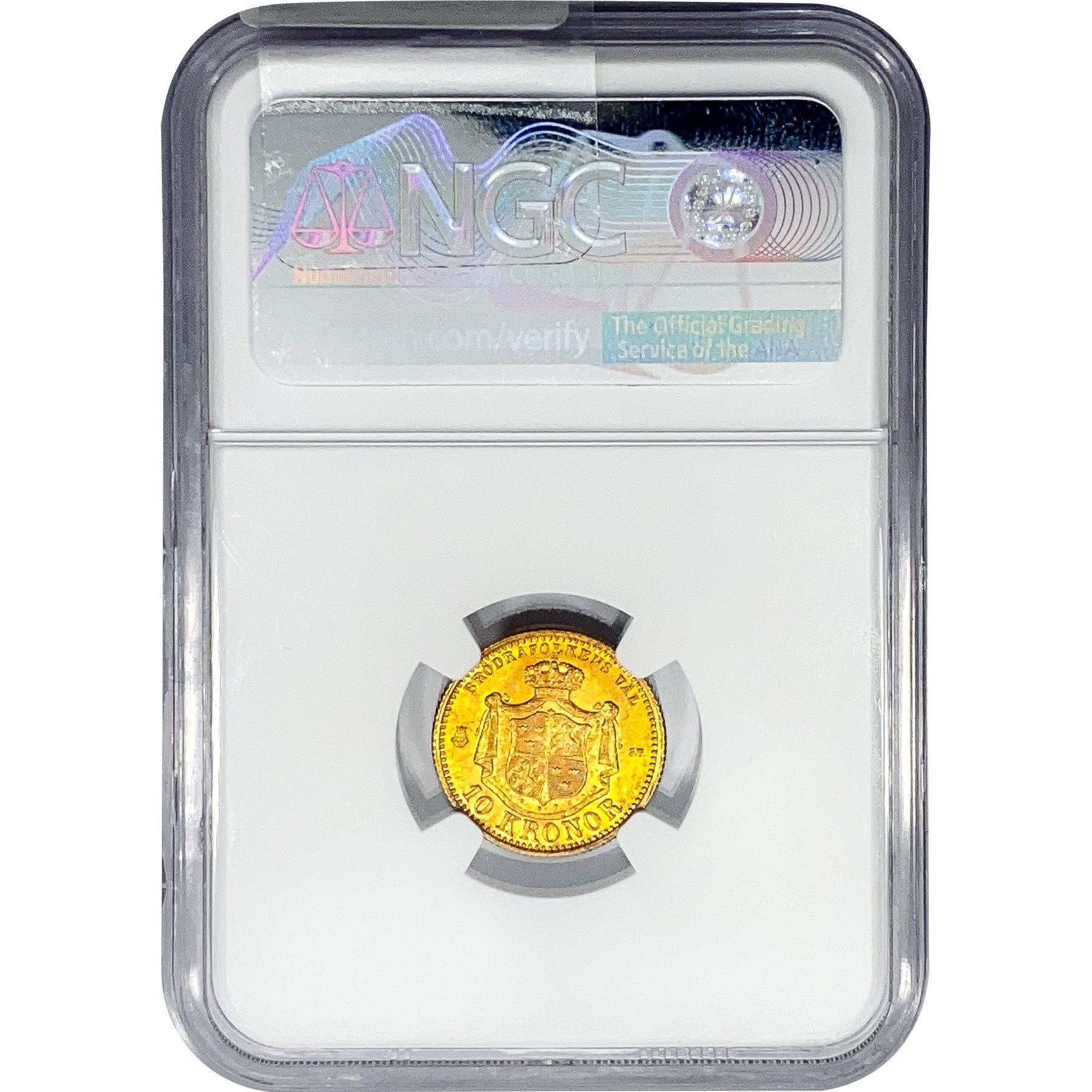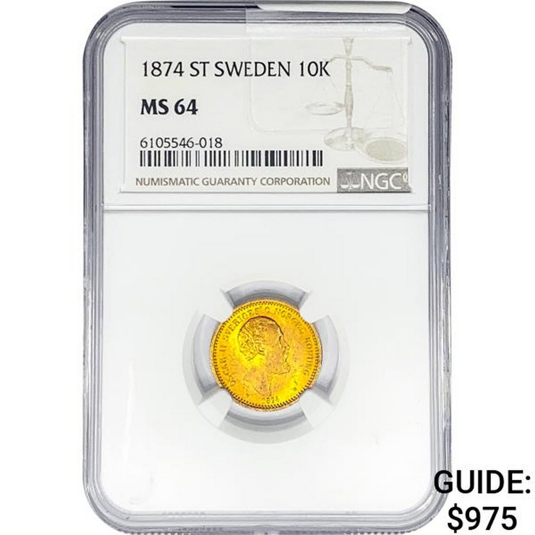 1874 .1296oz. Gold ST Sweden 10 Kroner NGC MS64
