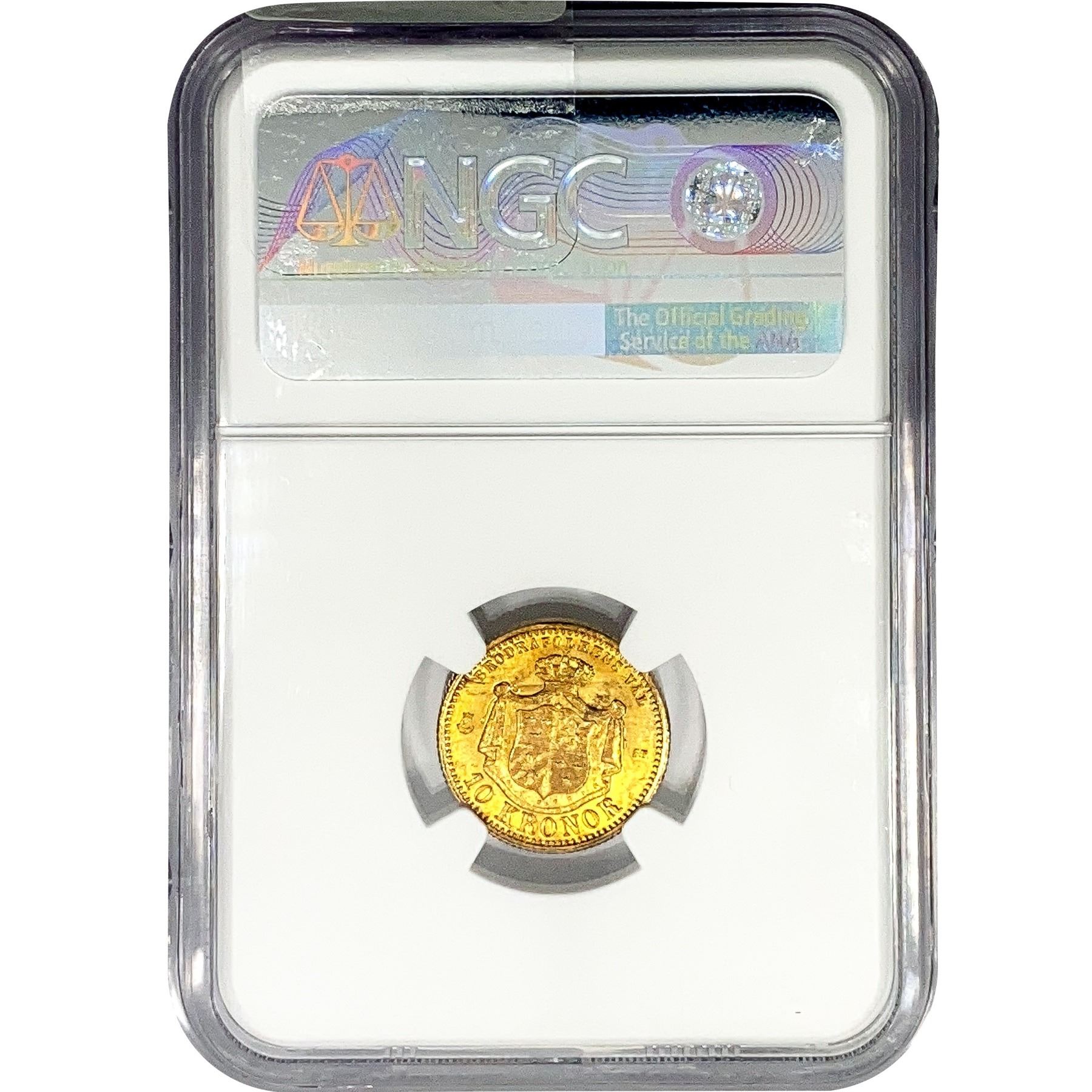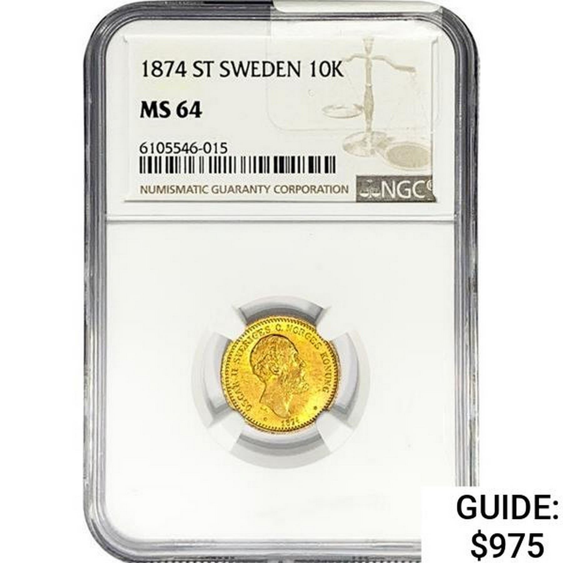 1874 .1296oz. Gold ST Sweden 10 Kroner NGC MS64