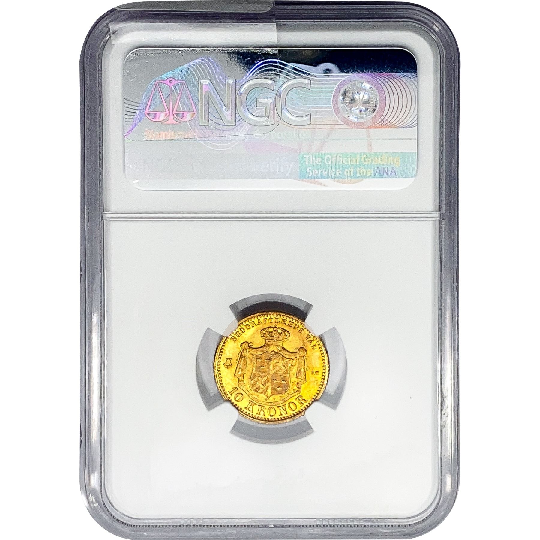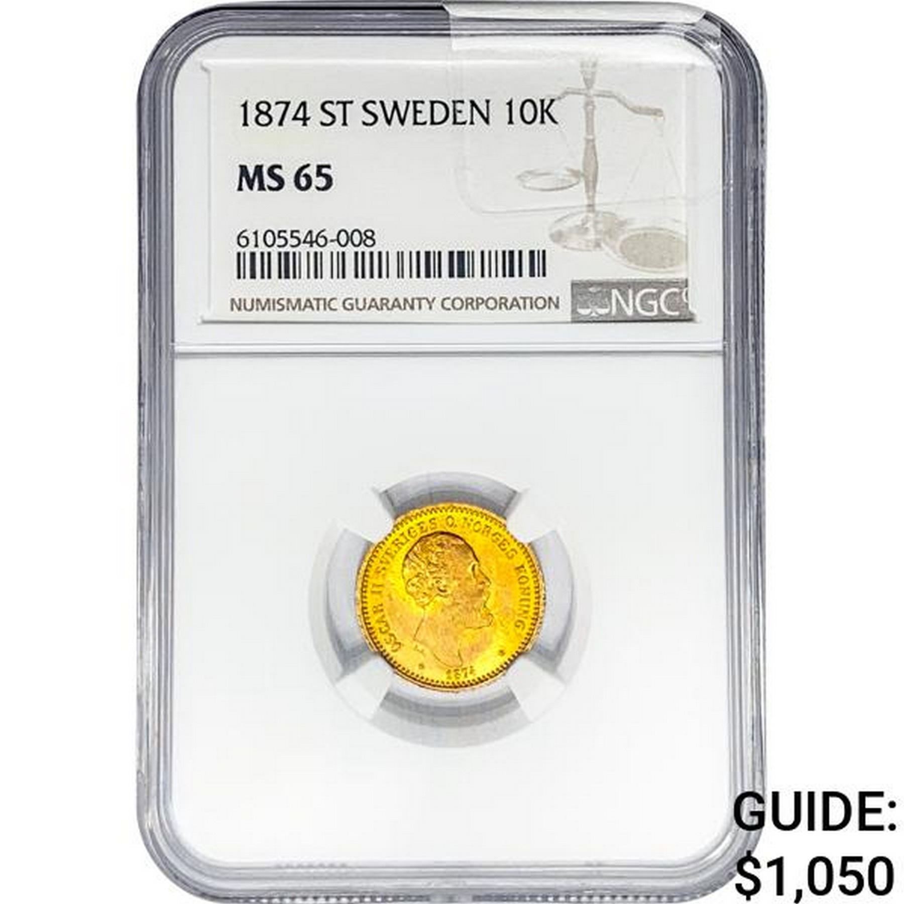 1874 .1296oz. Gold ST Sweden 10 Kroner NGC MS65