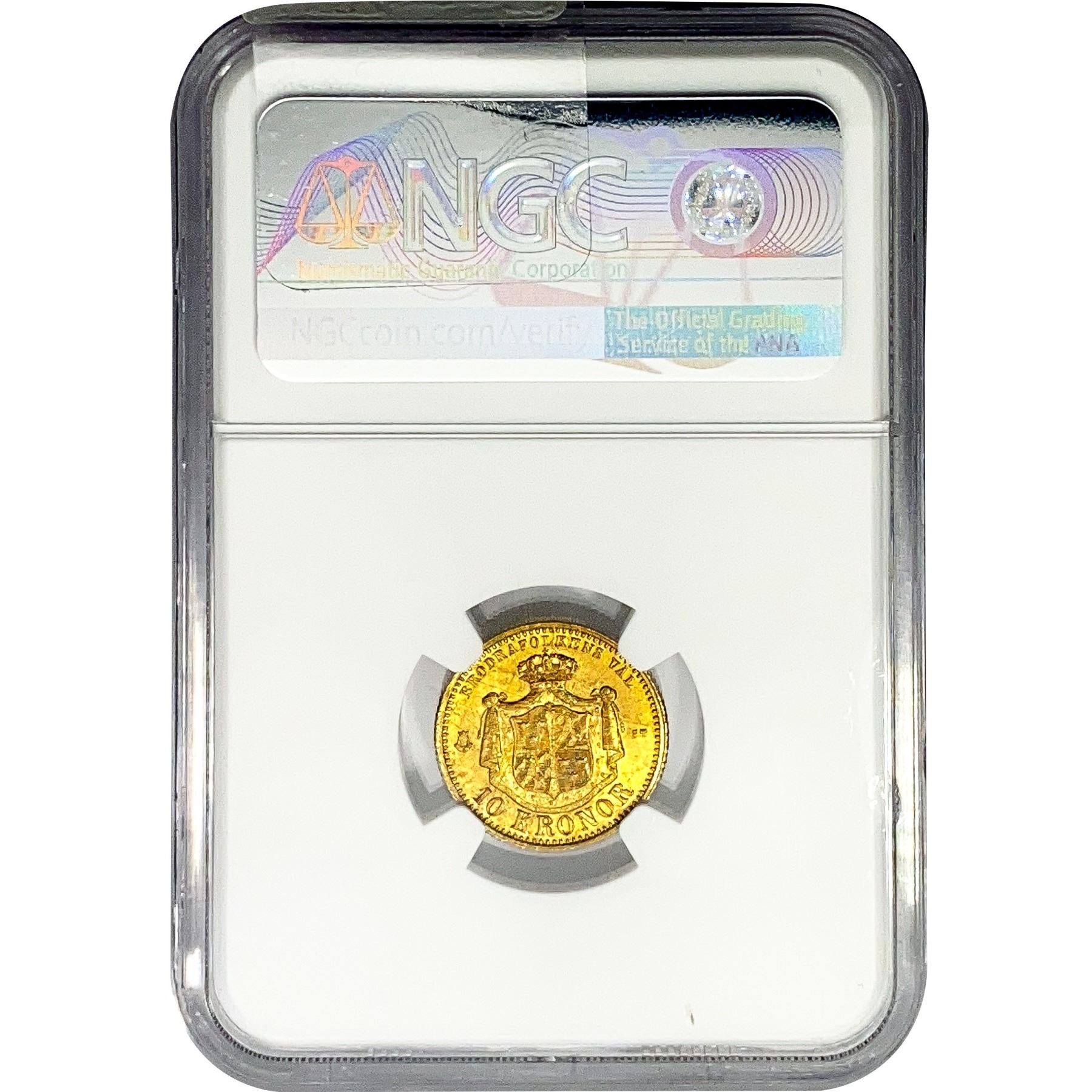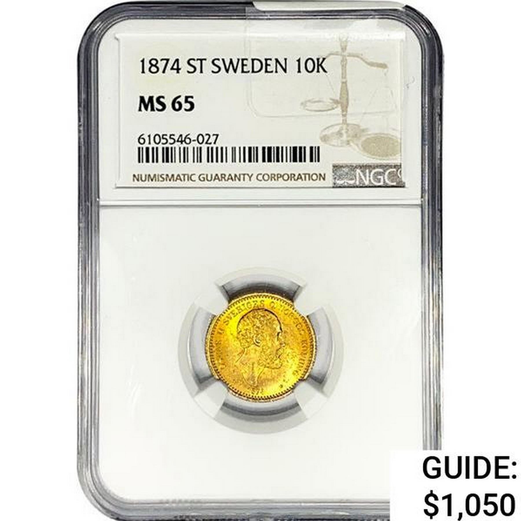 1874 .1296oz. Gold ST Sweden 10 Kroner NGC MS65