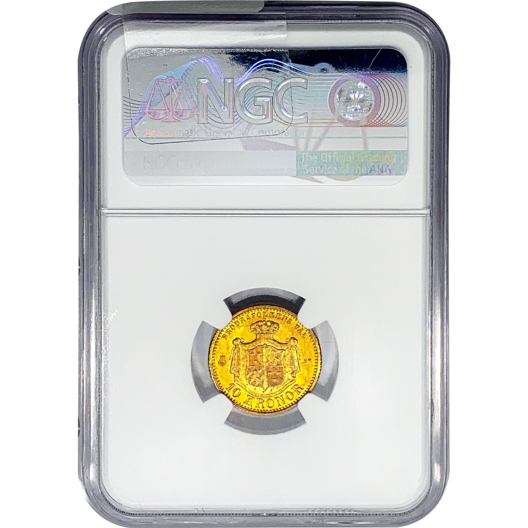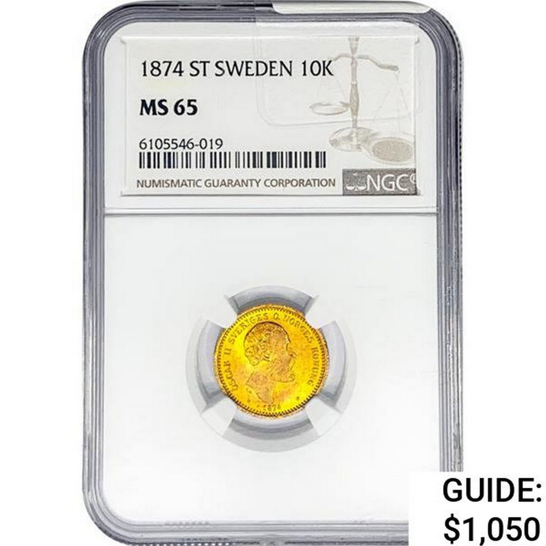 1874 .1296oz. Gold ST Sweden 10 Kroner NGC MS65