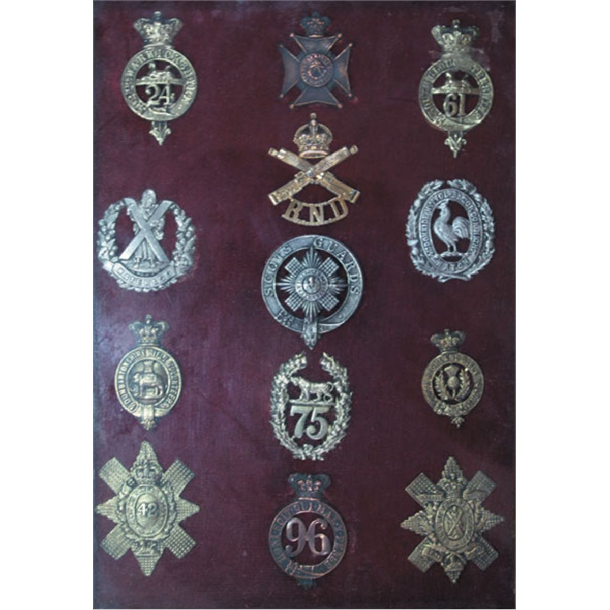 Collection of British Army badges including 24th, 61st, 75th and 96th Foot 1874-1881 pattern glengarry badges, Scots Guards pipers badge and Royal Naval Division machine gun battalion cap badge. Includes some reproductions. (13 items)
