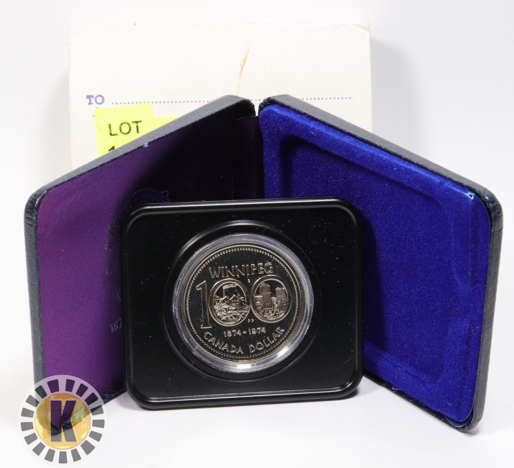A SPECIAL MARKED COMMEMORATIVE BLUE CLAMSHELL CASE WITH CITY OF WINNIPEG EMBLEM WITH 1874-1974 PRINTED ON PURPLE MATERIAL INSIDE BOX P.L. 67 COIN ENCAPSULATED WHOLE SERIES ONLY MINTED 2,799,363 IN BRILLIANT RELIEF.HARDER TO COME BY AS THESE ARE BEING MELTED BY THE GOVERNMENT OF CANADA. NOT A CIRCULATION COIN. BEAUTIFUL COIN AND DETAIL FOR COLLECTORS. PL (Proof-like): Special coins struck at the Mint with a brilliant relief is struck on a brilliant field and not intended for circulation despite the fact that their composition is identical to the coins produced for circulation. If Proof-like coins have been removed from their protective envelope or original package, it is harder to differentiate them from uncirculatedcoins. Also called Brilliant uncirculated (BUNC).***ITEM(S) LOCATED IN LETHBRIDGE ALBERTA