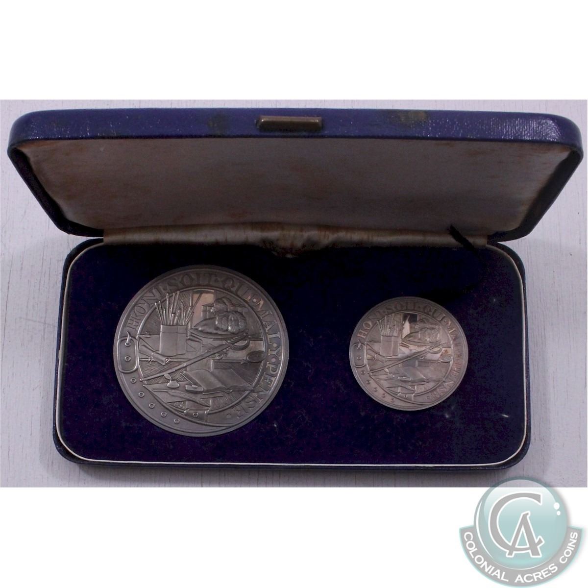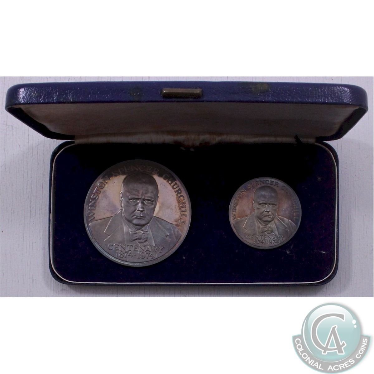 1874-1974 Sir Winston Churchill 2-coin Silver medal set commemorating the 100th Anniversary of the birth of Sir Winston Churchill. each medal is numbered 0051 from an issue of 5,000 and fully hallmarked. Coin are toned and comes in the original blue display case, however the case is showing sign of aging with worn spots and inner lining is discoloured.