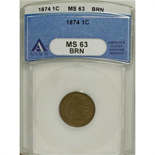 <B>1874 1C MS63 Brown ANACS.</B></I> NGC Census: (31/80). PCGS Population (21/24). Mintage: 14,187,500. Numismedia Wsl. Price for NGC/PCGS coin in MS63: $167. (#2118)<BR><BR><B>Coin Engraver:</B> James B. Longacre<BR><BR><b>Shipping:</b> Coins & Currency (<a target="_blank" href="http://www.heritageauctions.com/common/shipping.php">view shipping information</a>)