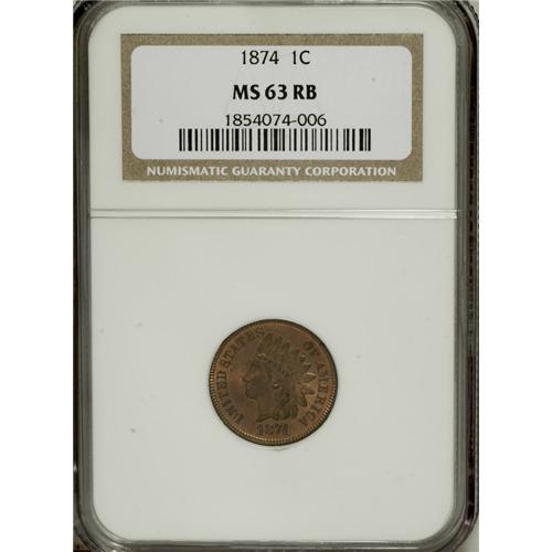 <B>1874 1C MS63 Red and Brown NGC.</B></I> NGC Census: (35/245). PCGS Population (87/277). Mintage: 14,187,500. Numismedia Wsl. Price: $204. (#2119)<BR><BR><b>Shipping:</b> Coins & Currency (<a target="_blank" href="http://www.heritageauctions.com/common/shipping.php">view shipping information</a>)