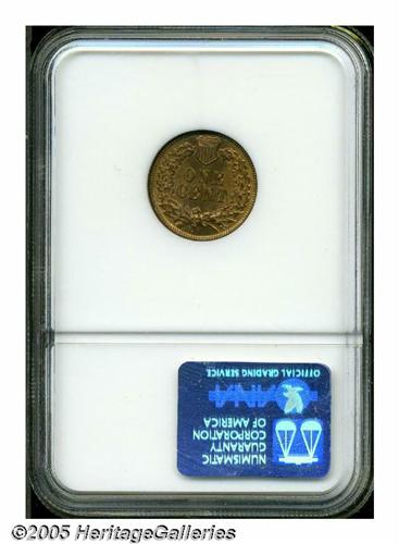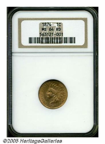 <B>1874<1C> MS64 Red NGC.</B></I> The lustrous surfaces portray attractive coppery-gold patina, imbued with occasional accents of lime-green, magenta-rose, and yellow colors. The design elements reveal excellent striking detail throughout. A few miniscule marks on the Indian's forehead and cheek, and at the bottom of the date, define the grade. NGC has certified just 23 coins higher (3/05).