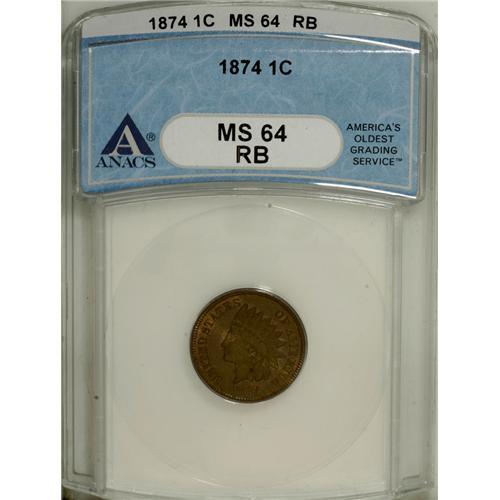 <B>1874 1C MS64 Red and Brown ANACS.</B></I> NGC Census: (120/124). PCGS Population (202/75). Mintage: 14,187,500. Numismedia Wsl. Price: $292. (#2119)<BR><BR><b>Shipping:</b> Coin/Currency (<a target="_blank" href="http://www.heritageauctions.com/common/shipping.php">view shipping information</a>)