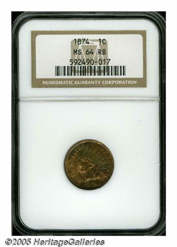 <B>1874<1C> MS64 Red and Brown NGC.</B></I> Mottled gold and walnut color with near-full definition and no significant imperfections. A near-Gem example.