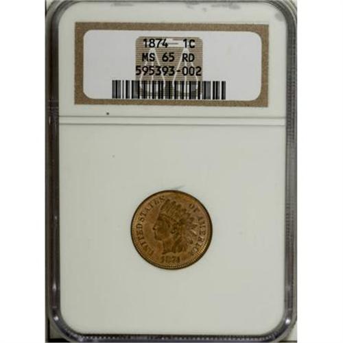 <B>1874 1C MS65 Red NGC.</B></I> Boldly detailed with a bright honey-tan appearance along with the occasional blush of pale orange patina on both obverse and reverse. A wispy die crack extends horizontally across the base of the obverse, touching three of the four digits in the date. <I><BR>From The Santa Fe Collection.</B></I><BR><BR><B>Coin Engraver:</B> James B. Longacre<BR><BR><b>Shipping:</b> Coins & Currency (<a target="_blank" href="http://www.heritageauctions.com/common/shipping.php">view shipping information</a>\)
