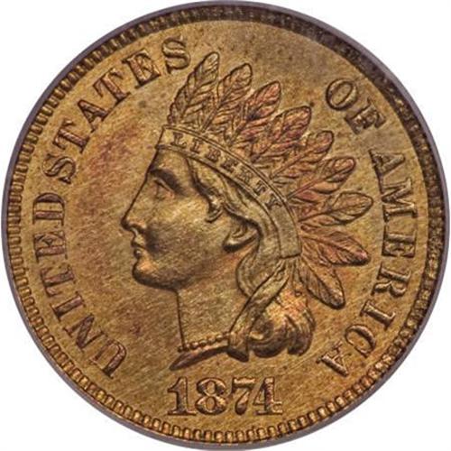 <B>1874 1C MS66 Red PCGS.</B></I> In his <I>A Guide Book of Flying Eagle and Indian Head Cents</B></I>, Richard Snow says of the 1874 cent, "... with mintages climbing slightly this year (14,187,500 circulation strikes), this date is more readily available than the earlier dates in the 1870s." Snow's assertion notwithstanding, coins with fully Red color are quite elusive. PCGS and NGC have seen approximately 150 such examples, the vast majority of which are in the near-Gem grade category.<BR> A medley of copper-gold, mint-green, and orange color rests upon the radiantly lustrous surfaces of the Red Premium Gem in this lot, and a well directed strike brings out sharp detail on the design features. This includes the feather tips, diamonds, shield lines, and leaf ribbing on the wreath. Near pristine surfaces are devoid of mentionable contact marks or unsightly spots. A truly gorgeous Indian cent! Population: 5 in 66 Red, 0 finer (7/07).<I><BR>From The Santa Fe Collection.</B></I><BR><BR><B>Coin Engraver:</B> James B. Longacre<BR><BR><b>Shipping:</b> Coins & Currency (<a target="_blank" href="http://www.heritageauctions.com/common/shipping.php">view shipping information</a>\)