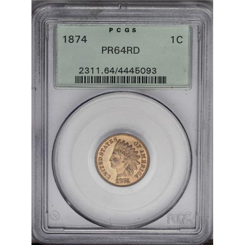 <B>1874<1C> PR64 Red PCGS.</B></I> Snow-1. A well struck olive-gold near-Gem with impressive surfaces. A minute carbon fleck above the O in OF is barely worthy of individual mention. Encapsulated in an older green label holder. The 4 in the date is recut, diagnostic for the proof issue. Population: 27 in 64, 16 finer (4/06).<BR><I>From The Empire Tree Collection.</B></I>