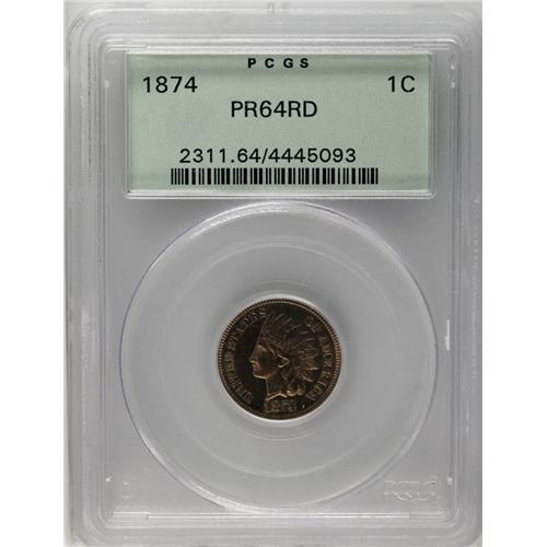<B>1874<1C> PR64 Red PCGS.</B></I> Snow-1. A well struck olive-gold near-Gem with impressive surfaces. A minute carbon fleck above the O in OF is barely worthy of individual mention. Encapsulated in an older green label holder. The 4 in the date is recut, diagnostic for the proof issue. Population: 27 in 64, 16 finer (6/06).<BR><I>From The Empire Tree Collection, Part Two.</B></I>
