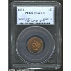 1874 1C PR64 Red PCGS. The 4 in the date is recut, which appears as an extension of the diagonal bar. Well struck with radiant peach color and exquisite surfaces. Population: 24 in 64, 18 finer (7/02). Important notice: We expect to be auctioning lots at the rate of 200-250 per hour. Sometimes eBay Premier live bid software cannot keep up with that pace, so we strongly recommend that you place a realistic proxy bid now as insurance to avoid disappointment. Also please note that all Heritage/CAA lots purchased through eBay Premier carry a 20% Buyer's Premium. Please make sure you read the Terms and Conditions.