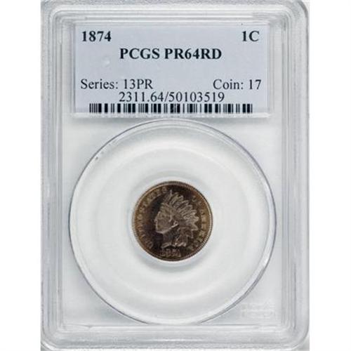 <B>1874 1C PR64 Red PCGS.</B></I> Boldly impressed with excellent visual appeal for the grade assigned. The obverse is salmon-pink with a splash of peach at the right periphery, while the reverse offers paler copper-gold hues with subtle emerald overtones. Population: 27 in 64 Red, 17 finer (10/07).<BR><BR><B>Coin Engraver:</B> James B. Longacre<BR><BR><b>Shipping:</b> Coins & Currency (<a target="_blank" href="http://www.heritageauctions.com/common/shipping.php">view shipping information</a>)
