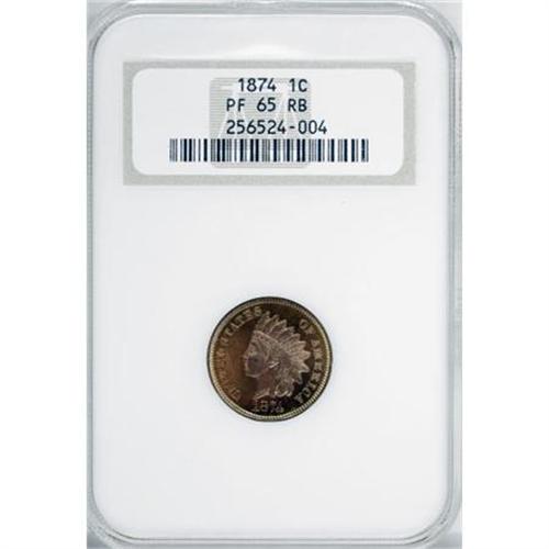 <B>1874 1C PR65 Red and Brown NGC.</B></I> Only 700 proofs were struck, and apparently all of these have a repunched 4 in the date. This beautiful Gem is mostly orange and yellow-gold, with a blush of rose-red on the central reverse. The cheek has minor carbon. Housed in a prior generation holder.<BR><BR><B>Coin Engraver:</B> James B. Longacre<BR><BR><b>Shipping:</b> Coins & Currency (<a target="_blank" href="http://www.heritageauctions.com/common/shipping.php">view shipping information</a>)