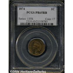 <B>1874<1C> PR65 Red and Brown PCGS.</B></I> Fully struck with gorgeously reflective fields, beautiful apricot-brown and golden-tan colors, a single carbon fleck, near the center of the obverse, and a single small contact mark, on the reverse, on the E in CENT. A beautiful, exquisitely preserved Gem proof. <BR><BR><B>Important notice:</B> Heritage usually auctions material at the rate of 200-250 lots per hour. On some occasions eBay Live bid software or the Internet may not be able to keep up with the pace of the auction. We recommend placing a realistic absentee bid now as insurance to avoid disappointment. Occasionally the auctioneer may eliminate or reject an eBay Live bid, and the auctioneer may also reopen a lot after the close of the eBay live bidding (usually because we missed an audience bid), and may reject your bid even if it shows you as the winning bidder. By bidding via eBay Live, you agree that Heritage may award the lot to another bidder at its sole discretion under the circumstances described above or any other reasonable circumstances. Since eBay bids are not shown to us until we open the lot on the floor, we treat those bids just like floor bids. In most cases the floor responds before the eBay bid is presented to us, due to Internet lag time, so for consistency we have made it a policy that floor bids are always considered first over tie eBay live bids. Also please note that all Heritage lots purchased through eBay Live carry a 20% Buyer's Premium. Please make sure you read the Terms and Conditions before you bid.