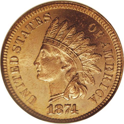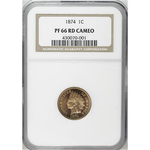 <B>1874<1C> PR66 Red Cameo NGC.</B></I> Snow-1. This scarce proof variant shows repunching visible below the vertical stand of the 4. Because of the scarcity of 1874 business strikes, proofs of this date enjoy added demand from collectors. This exceptional Premium Gem has bright, unmellowed golden-tan color overall and mildly frosted devices contrasted over highly reflective fields. The piece is sharply struck, well preserved, and free of hairlines or contact marks.