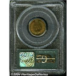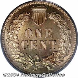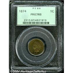 <B>1874<1C> PR67 Red and Brown PCGS.</B></I> The 1874 is not known as a well produced issue in proof format. The mirrors are generally light to moderate in reflectivity and there are usually extensive die finishing lines on the upper portion of the obverse. As one might imagine from the MS67 grade, this coin is significantly finer than the typical proof 1874. While not deeply mirrored, the fields are bright and reflective. The die finishing lines are definitely present when magnification is used, but these are light and not visible to the unaided eye. The surfaces have a lovely intermixture of lime-green and pale rose coloration. Essentially perfect and immaculately preserved. Tied for finest certified with only one other piece so graded, that being an NGC coin (9/04). <BR><BR><B>Important notice:</B> Heritage usually auctions material at the rate of 200-250 lots per hour. On some occasions eBay Live bid software or the Internet may not be able to keep up with the pace of the auction. We recommend placing a realistic absentee bid now as insurance to avoid disappointment. Occasionally the auctioneer may eliminate or reject an eBay Live bid, and the auctioneer may also reopen a lot after the close of the eBay live bidding (usually because we missed an audience bid), and may reject your bid even if it shows you as the winning bidder. By bidding via eBay Live, you agree that Heritage may award the lot to another bidder at its sole discretion under the circumstances described above or any other reasonable circumstances. Since eBay bids are not shown to us until we open the lot on the floor, we treat those bids just like floor bids. In most cases the floor responds before the eBay bid is presented to us, due to Internet lag time, so for consistency we have made it a policy that floor bids are always considered first over tie eBay live bids. Also please note that all Heritage lots purchased through eBay Live carry a 20% Buyer's Premium. Please make sure you read the Terms and Conditions before you bid.