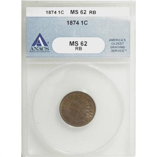 <B>1874 1C MS62 Red and Brown ANACS.</B></I> NGC Census: (4/288). PCGS Population (13/375). Mintage: 14,187,500. Numismedia Wsl. Price for NGC/PCGS coin in MS62: $162. (#2119)<BR><BR><B>Coin Engraver:</B> James B. Longacre<BR><BR><b>Shipping:</b> Coins & Currency (<a target="_blank" href="http://www.heritageauctions.com/common/shipping.php">view shipping information</a>)