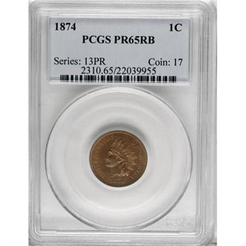 <B>1874 1C PR65 Red and Brown PCGS.</B></I> PCGS Population (30/7). NGC Census: (33/14). Mintage: 700. Numismedia Wsl. Price for NGC/PCGS coin in PR65: $625. (#2310)<BR><BR><B>Coin Engraver:</B> James B. Longacre<BR><BR><b>Shipping:</b> Coins & Currency (<a target="_blank" href="http://www.heritageauctions.com/common/shipping.php">view shipping information</a>)