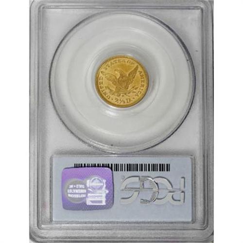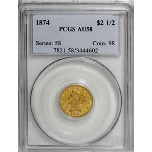 <B>1874 $2 1/2 AU58 PCGS.</B></I> This is a pleasing near-Mint quarter eagle, with lovely apricot-gold and rose patina and lightly worn surfaces that seem close to Mint State. A few wispy marks are noted on each side. A low mintage issue of just 3,940 business strikes. Population: 9 in 58, 16 finer (7/07). <BR><BR><B>Coin Engraver:</B> Christian Gobrecht<BR><BR><b>Shipping:</b> Coins & Currency (<a target="_blank" href="http://www.heritageauctions.com/common/shipping.php">view shipping information</a>)