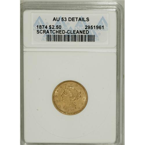 <B>1874 $2 1/2 --Cleaned, Scratched--ANACS. AU53 Details.</B></I> NGC Census: (6/89). PCGS Population (5/35). Mintage: 3,940. Numismedia Wsl. Price for NGC/PCGS coin in AU53: $625. (#7821)<BR><BR><b>Shipping:</b> Coins & Currency (<a target="_blank" href="http://www.heritageauctions.com/common/shipping.php">view shipping information</a>)