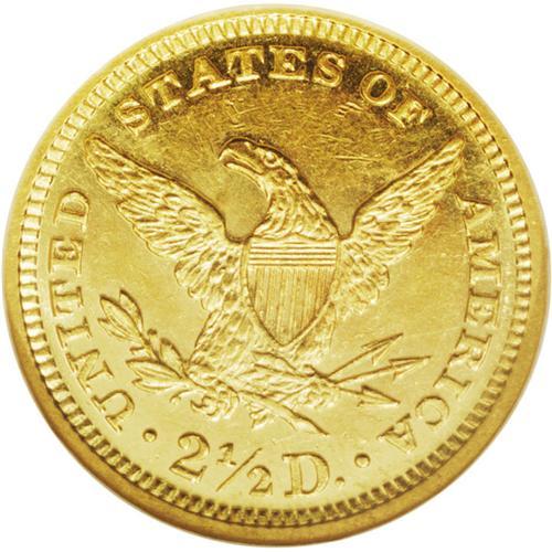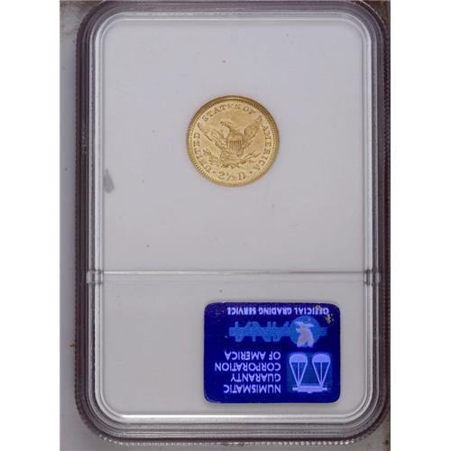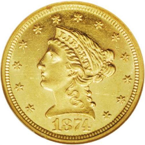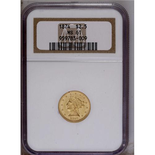<B>1874 $2 1/2 MS61 NGC.</B></I> Mildly prooflike with pinpoint striking details, as might be expected of an issue of just 3,920 business strikes. A moderate number of field marks on either side affect the technical merit of this difficult 1870s quarter eagle. Census: 18 in 61, 8 finer (1/06).