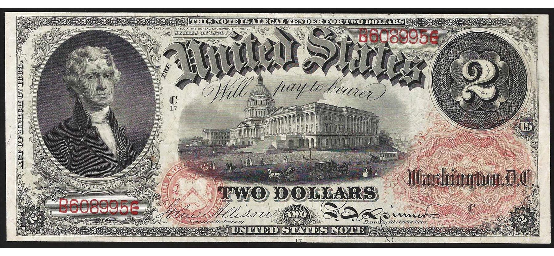 One 1874 $2 Legal Tender Note.