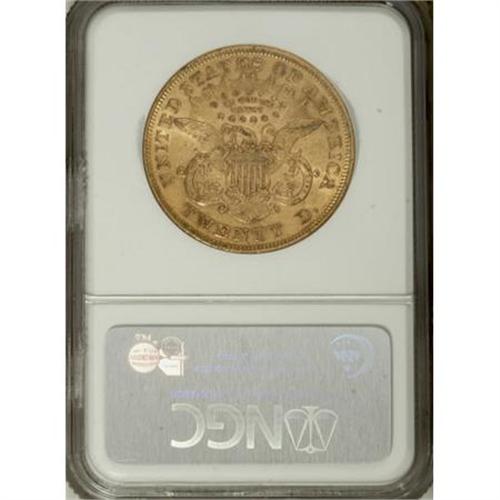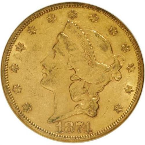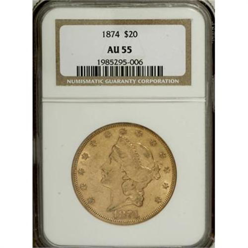<B>1874 $20 AU55 NGC.</B></I> NGC Census: (110/603). PCGS Population (117/202). Mintage: 366,800. Numismedia Wsl. Price for NGC/PCGS coin in AU55: $715. (#8970)<BR><BR><B>Coin Engraver:</B> James B. Longacre<BR><BR><b>Shipping:</b> Coins & Currency (<a target="_blank" href="http://www.heritageauctions.com/common/shipping.php">view shipping information</a>\)