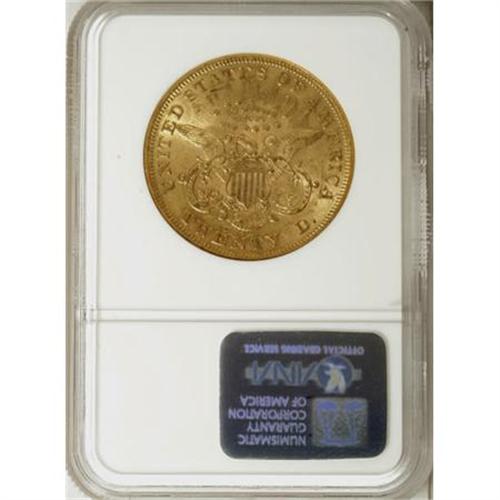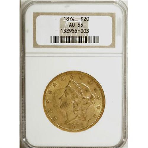 <B>1874 $20 AU55 NGC.</B></I> NGC Census: (110/622). PCGS Population (121/210). Mintage: 366,800. Numismedia Wsl. Price for NGC/PCGS coin in AU55: $810. (#8970)<BR><BR><B>Coin Engraver:</B> James B. Longacre<BR><BR><b>Shipping:</b> Coins & Currency (<a target="_blank" href="http://www.heritageauctions.com/common/shipping.php">view shipping information</a>)