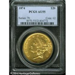 1874 $20 AU55 PCGS. A somewhat scarcer Type Two Do <B>1874 $20 AU55 PCGS.</B></I> A somewhat scarcer Type Two Double Eagle. This is a well struck piece with the usual small but numerous abrasions on each side but good remaining luster. <BR><BR><B>Important notice:</B> Heritage usually auctions material at the rate of 200-250 lots per hour. On some occasions eBay Live bid software or the Internet may not be able to keep up with the pace of the auction. We recommend placing a realistic absentee bid now as insurance to avoid disappointment. Occasionally the auctioneer may eliminate or reject an eBay Live bid, and the auctioneer may also reopen a lot after the close of the eBay live bidding (usually because we missed an audience bid), and may reject your bid even if it shows you as the winning bidder. By bidding via eBay Live, you agree that Heritage may award the lot to another bidder at its sole discretion under the circumstances described above or any other reasonable circumstances. Since eBay bids are not shown to us until we open the lot on the floor, we treat those bids just like floor bids. In most cases the floor responds before the eBay bid is presented to us, due to Internet lag time, so for consistency we have made it a policy that floor bids are always considered first over tie eBay live bids. Also please note that all Heritage lots purchased through eBay Live carry a 20% Buyer's Premium. Please make sure you read the Terms and Conditions before you bid. This lot is being auctioned in conjunction with a live floor auction by Heritage Galleries & Auctioneers. All final auction and invoice information will be supplied by Heritage Galleries & Auctioneers, and all other information should be considered preliminary. Lot:6890