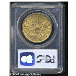 1874 $20 AU55 PCGS. Bright luster illuminates the <B>1874 $20 AU55 PCGS.</B></I> Bright luster illuminates the legends and devices of this moderately marked example. Much of the central arrow shaft is not present, as struck from a lapped die. <BR><BR><B>Important notice:</B> Heritage usually auctions material at the rate of 200-250 lots per hour. On some occasions eBay Live bid software or the Internet may not be able to keep up with the pace of the auction. We recommend placing a realistic absentee bid now as insurance to avoid disappointment. Occasionally the auctioneer may eliminate or reject an eBay Live bid, and the auctioneer may also reopen a lot after the close of the eBay live bidding (usually because we missed an audience bid), and may reject your bid even if it shows you as the winning bidder. By bidding via eBay Live, you agree that Heritage may award the lot to another bidder at its sole discretion under the circumstances described above or any other reasonable circumstances. Since eBay bids are not shown to us until we open the lot on the floor, we treat those bids just like floor bids. In most cases the floor responds before the eBay bid is presented to us, due to Internet lag time, so for consistency we have made it a policy that floor bids are always considered first over tie eBay live bids. Also please note that all Heritage lots purchased through eBay Live carry a 20% Buyer's Premium. Please make sure you read the Terms and Conditions before you bid. This lot is being auctioned in conjunction with a live floor auction by Heritage Galleries & Auctioneers. All final auction and invoice information will be supplied by Heritage Galleries & Auctioneers, and all other information should be considered preliminary. Lot:6889