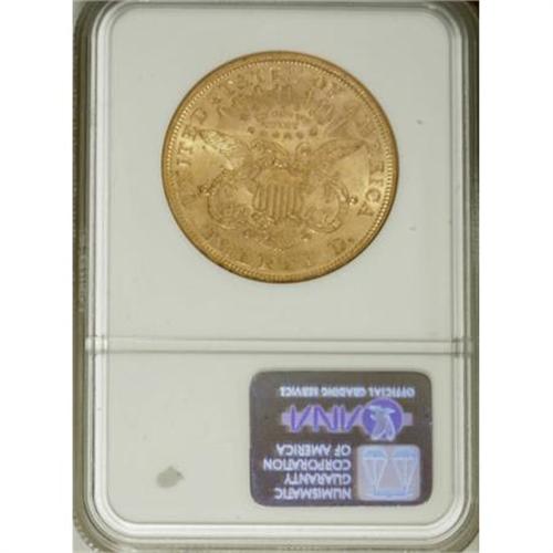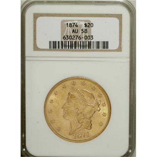 <B>1874 $20 AU58 NGC.</B></I> The cartwheel luster is virtually complete, and the absence of individually noteworthy marks makes this example attractive for its grade and denomination. <BR><BR><B>Coin Engraver:</B> James B. Longacre<BR><BR><b>Shipping:</b> Coins & Currency (<a target="_blank" href="http://www.heritageauctions.com/common/shipping.php">view shipping information</a>)