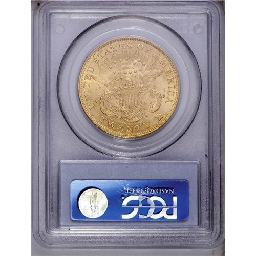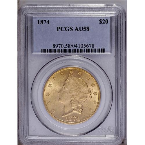 <B>1874<$20> AU58 PCGS.</B></I> A somewhat scarcer Type Two twenty. This is a well struck piece with the usual small but numerous abrasions on each side, but good remaining luster and frosty, sparkling yellow-gold surfaces. Much brighter than the typical AU or Mint State gold coin from the 1870s. <BR><BR><B>Important notice:</B> Heritage usually auctions material at the rate of 200-250 lots per hour. On some occasions eBay Live bid software or the Internet may not be able to keep up with the pace of the auction. We recommend placing a realistic absentee bid now as insurance to avoid disappointment. Occasionally the auctioneer may eliminate or reject an eBay Live bid, and the auctioneer may also reopen a lot after the close of the eBay live bidding (usually because we missed an audience bid), and may reject your bid even if it shows you as the winning bidder. By bidding via eBay Live, you agree that Heritage may award the lot to another bidder at its sole discretion under the circumstances described above or any other reasonable circumstances. Since eBay bids are not shown to us until we open the lot on the floor, we treat those bids just like floor bids. In most cases the floor responds before the eBay bid is presented to us, due to Internet lag time, so for consistency we have made it a policy that floor bids are always considered first over tie eBay live bids. Also please note that all Heritage lots purchased through eBay Live carry a 20% Buyer's Premium. Please make sure you read the Terms and Conditions before you bid. This lot is being auctioned in conjunction with a live floor auction by Heritage Galleries & Auctioneers. All final auction and invoice information will be supplied by Heritage Galleries & Auctioneers, and all other information should be considered preliminary. Lot:4250 <BR><BR><B>Winning Notification and Billing:</B> After the FINAL session in this auction is complete, Heritage will send e-mail and snail mail invoices. This process normally takes several days. All final auction and invoice information will be supplied by Heritage Galleries & Auctioneers, and all other information should be considered preliminary. <BR><BR>This auction will be conducted on a live auction floor and over the Internet through eBay Live. If you choose to place an absentee bid, please take a moment to <font color='#0000ff'><u><a href='http://pages.ebay.com/liveauctions/help/before/laabsentee.html'>learn how eBay Live absentee bidding works</a></u></font><font color='#000000'>
