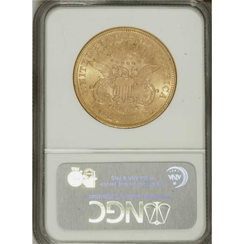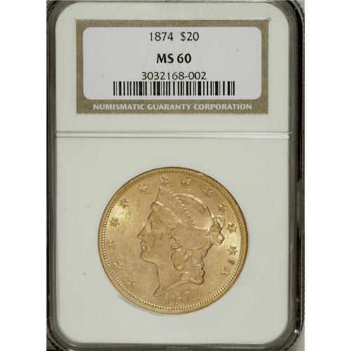 <B>1874 $20 MS60 NGC.</B></I> This Type Two double eagle issue is elusive in any Mint State grade. This unworn, shimmering piece is well struck and has soft yellow-gold surfaces with a touch of brick-red to the right of the bust. Numerous scattered obverse abrasions confirm the grade.<BR><BR><b>Shipping:</b> Coins & Currency (<a target="_blank" href="http://www.heritageauctions.com/common/shipping.php">view shipping information</a>)