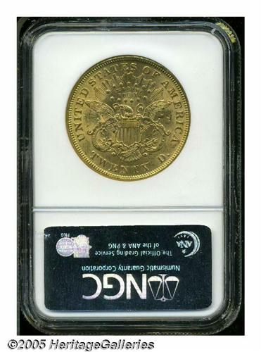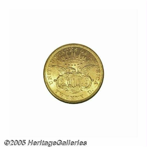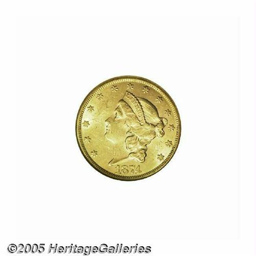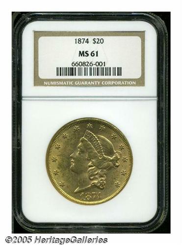 <B>1874<$20> MS61 NGC.</B></I> The mint luster is complete but interrupted by numerous abrasions, especially on the obverse. Well defined and desirable as a type coin. Population: 90 in 61, 15 finer (6/05).