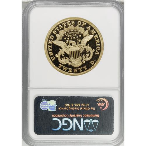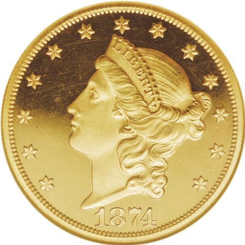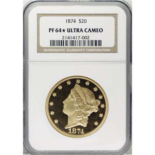 <B>1874 $20 PR64 <img border='0' src='http://www.heritagecoins.com/images/star.gif' width=10 height=10> Ultra Cameo NGC.</B></I> While the circulation-strike examples of the 1874 double eagle are relatively common (366,780 mintage), proofs of this dated are extremely rare. Only 20 coins were struck, making this the lowest number of proof double eagles produced after 1858. Writing in their recent book <I>Encyclopedia of U.S. Gold Coins, 1795-1933,</B></I> Jeff Garrett and Ron Guth say that: "Today, fewer than 10 examples can be traced, including the two that are housed in the Smithsonian and the American Numismatic Society. At least one or two examples known are seriously impaired. The date has also been missing from many important collections offered in the last two decades, including the Harry W. Bass Jr. Collection, which was nearly complete. An NGC PR-64 coin sold at auction in mid-2004 for $103,500."<BR><BR> David Akers, writing in <I>United States Gold Coins, An Analysis of Auction Records, Volume VI, Double Eagles, 1849-1933,</B></I> states that: "Proofs of this date (1874) are among the rarest after 1860. Of the 20 minted, less than half can be accounted for today." Douglas Winter and Michael Fuljenz, in their treatise entitled <I>Type Two Double Eagles, 1866-1876: A Numismatic History and Analysis,</B></I> state: "It is estimated that seven to nine of these (1874 proof double eagles) exist today with the finest being a lovely NGC Proof-64 which is part of the Ed Trompeter Collection of United States proof gold coins." And Walter Breen suggests that: "Possibly 7-9 proofs survive."<BR><BR> The population figures indicate that a total of 11 1874 proof twenties have been seen by NGC and PCGS. A PR60, a PR63, and two PR64's have been certified by PCGS. NGC graded one PR63 Cameo, and three PR64 Cameos. NGC certified one PR62 Ultra Cameo, while a PR62 Deep Cameo was seen by PCGS. An NGC-graded PR64 <img border='0' src='http://www.heritagecoins.com/images/star.gif' width=10 height=10> Ultra Cameo, the piece offered in the current sale, is the finest known of all certified 1874 double eagle proofs.<BR><BR> Both sides of this gorgeous 1874 near-Gem <img border='0' src='http://www.heritagecoins.com/images/star.gif' width=10 height=10> Ultra Cameo are embraced with attractive peach-gold color, and outstanding motif-field contrast assumes a gold-on-black appearance when the coin is viewed from directly overhead. A well-executed strike manifests itself in sharp definition on all of the design features, including the star centrils, Liberty's hair, the eagle's plumage, and the horizontal and vertical lines of the shield. An even higher grade is precluded by a few wispy obverse handling marks. A curved lint mark located beneath Liberty's eye may help to pedigree the coin. This outstanding example is sure to draw the interest of aficionados of gold coinage who want nothing but the best. As such, we expected spirited bidding on what is the finest known 1874 proof double eagle. Census: 1 in 64 <img border='0' src='http://www.heritagecoins.com/images/star.gif' width=10 height=10> Ultra Cameo, 0 finer (12/06).<BR><BR><b>Shipping:</b> Coin/Currency (<a target="_blank" href="http://www.heritageauctions.com/common/shipping.php">view shipping information</a>)