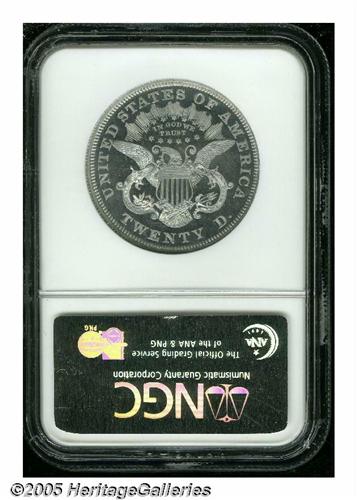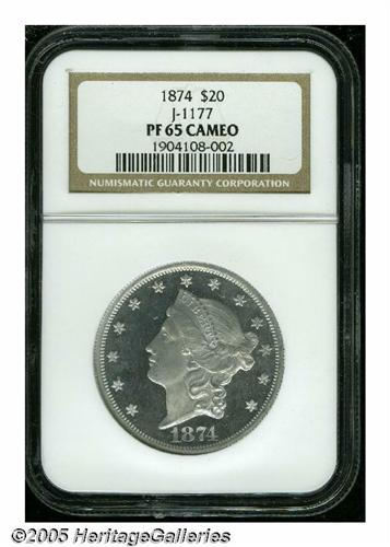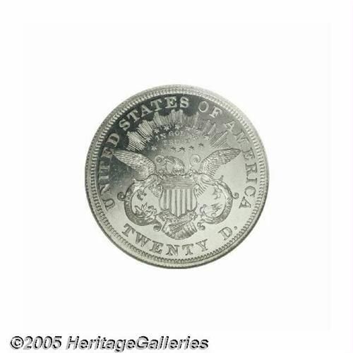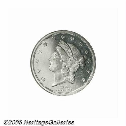 <B>1874<$20> Twenty Dollar, Judd-1382, Pollock-1527, R.8, PR65 Cameo NGC.</B></I> Struck in aluminum with a reeded edge from regular issue dies. An extremely rare dies trial piece, we believe that no example of Judd-1382 has appeared at auction since the Stack's ANA Auction of August 1976. Only two pieces have been certified by the grading services: a PCGS PR64 and the present example. All 1874 regular issue denominations are known to exist in aluminum format, which suggests that a few denomination sets were assembled, either for presentation purposes or to sell to well connected dealers or collectors. The present Gem exhibits good contrast between the intricately struck devices and the nicely mirrored fields. Hints of retained laminations are noted east of star 4 and north of star 5, another is beneath the left (facing) wing. These mint-made features will pedigree any future auction appearances of this desirable specimen, although it may be many years before an example of Judd-1382 reaches the auction block again.