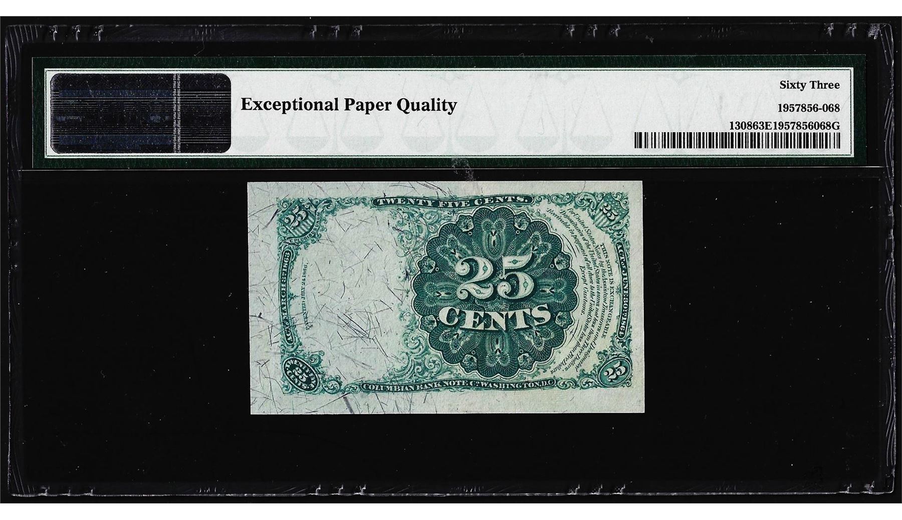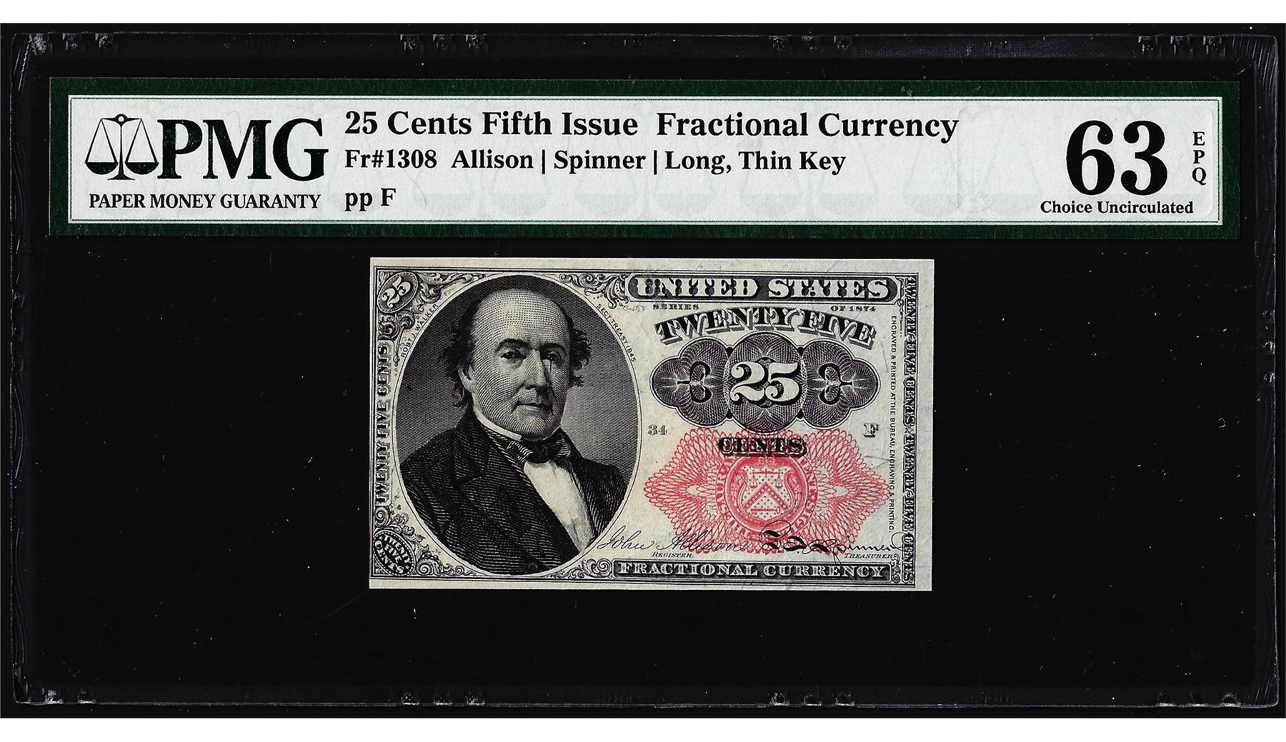 One 1874 25 Cent Fifth Issue Fractional Currency Note Fr.1308 PMG Choice Uncirculated 63EPQ. PMG Certified.