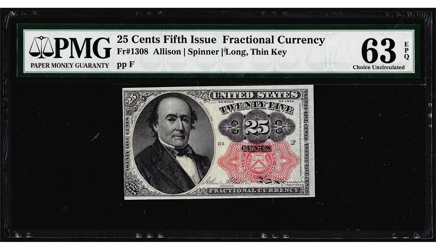 One 1874 25 Cent Fifth Issue Fractional Currency Note Fr.1308 PMG Choice Uncirculated 63EPQ. PMG Certified.