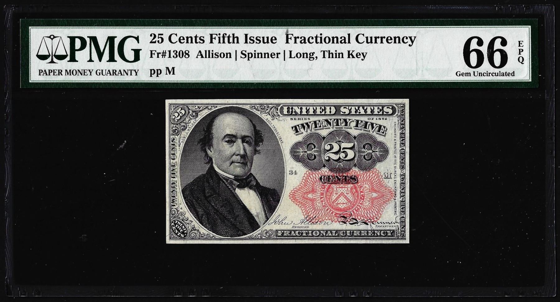 One 1874 25 Cent Fifth Issue Fractional Currency Note Fr.1308 PMG Choice Uncirculated 66EPQ.