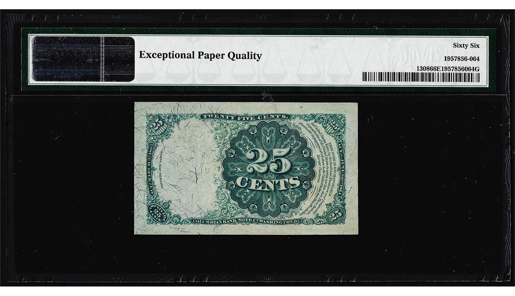 One 1874 25 Cent Fifth Issue Fractional Currency Note Fr.1308 PMG Choice Uncirculated 66EPQ. PMG Certified.