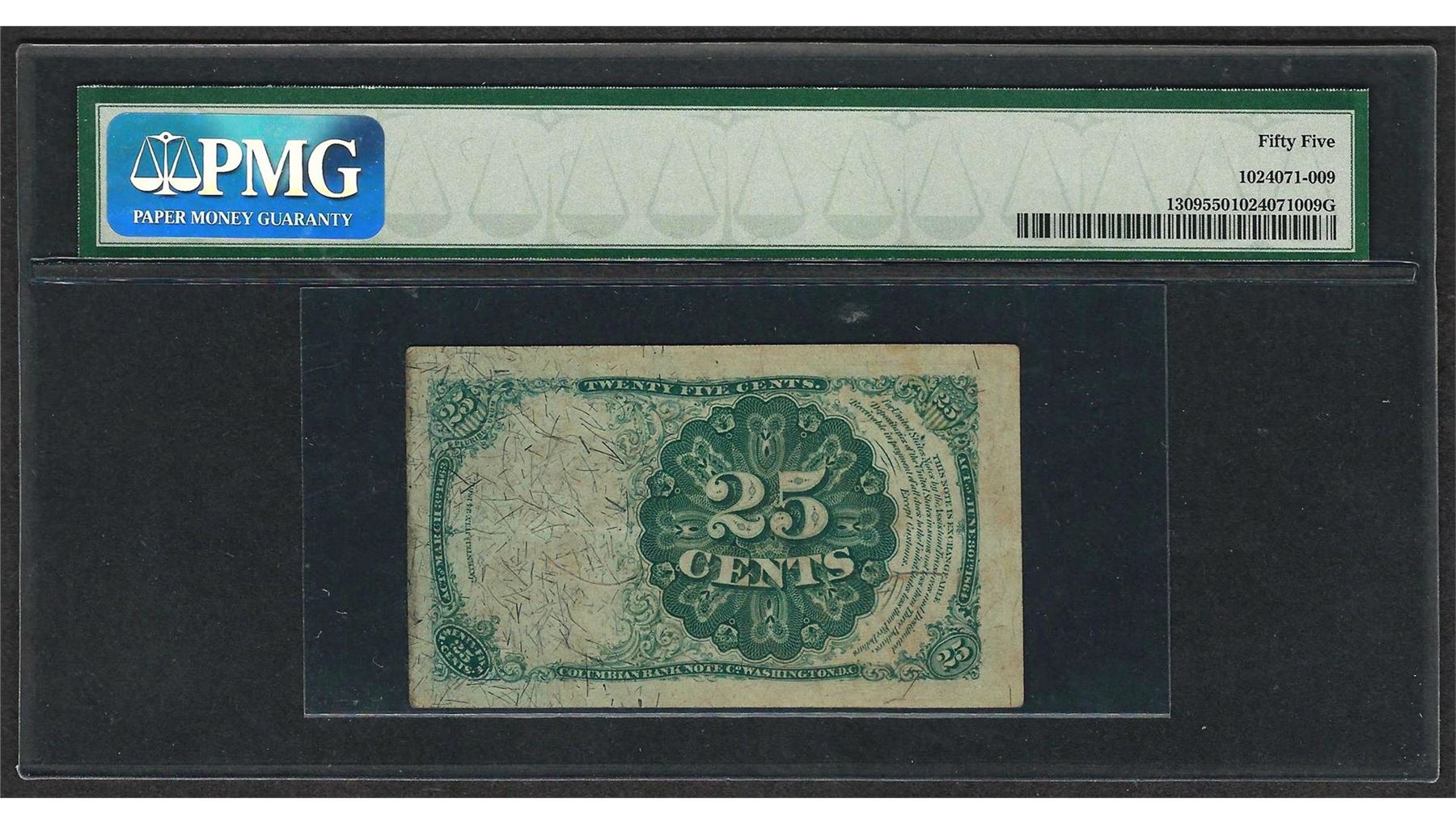 One 1874 25 Cent Fifth Issue Fractional Currency Note PMG About Uncirculated 55. PMG Certified.