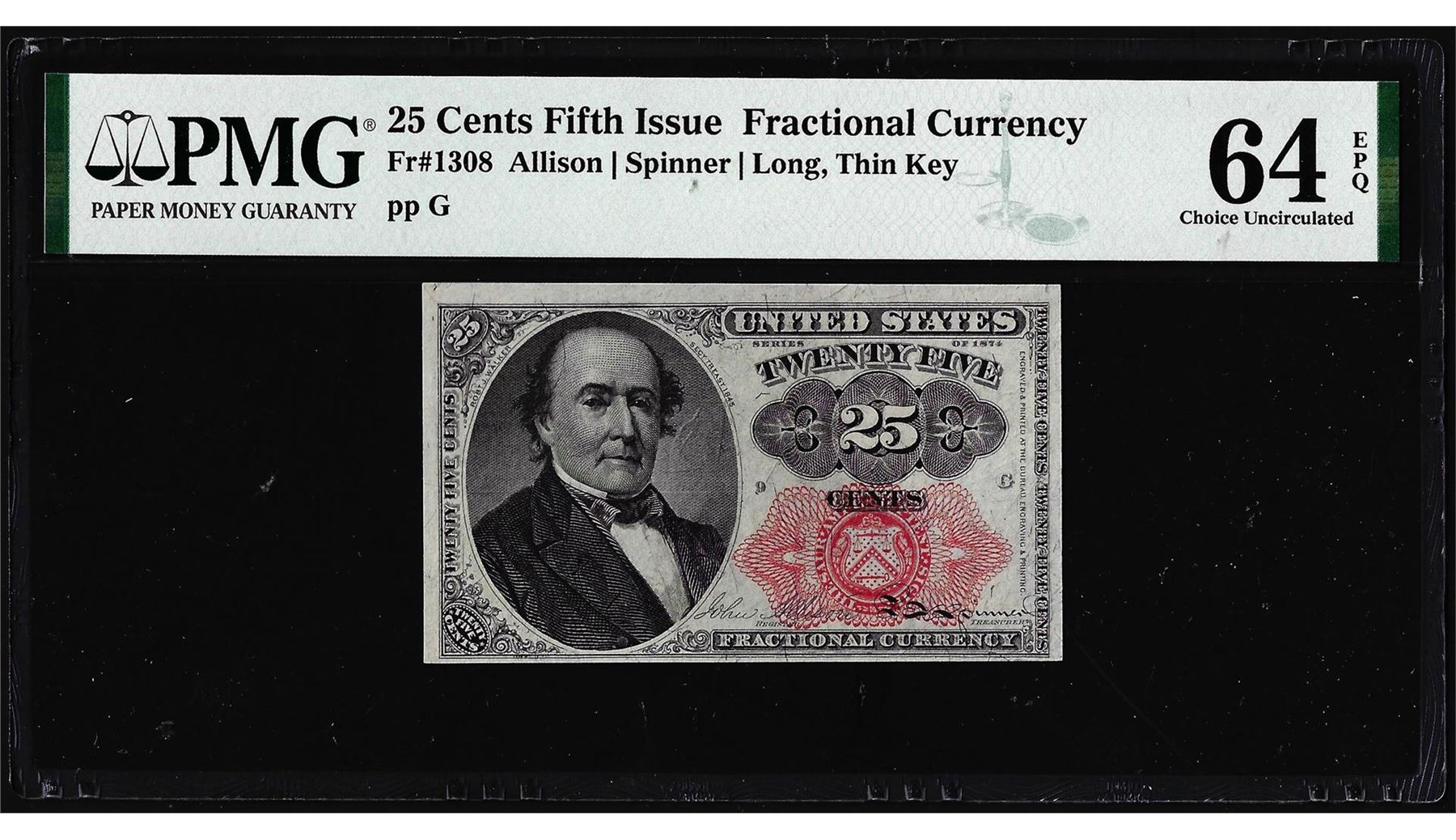 One 1874 25 Cent Fifth Issue Fractional Note Fr.1308 PMG Choice Uncirculated 64EPQ. PMG Certified.