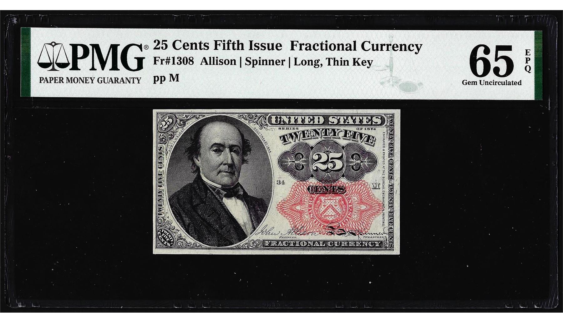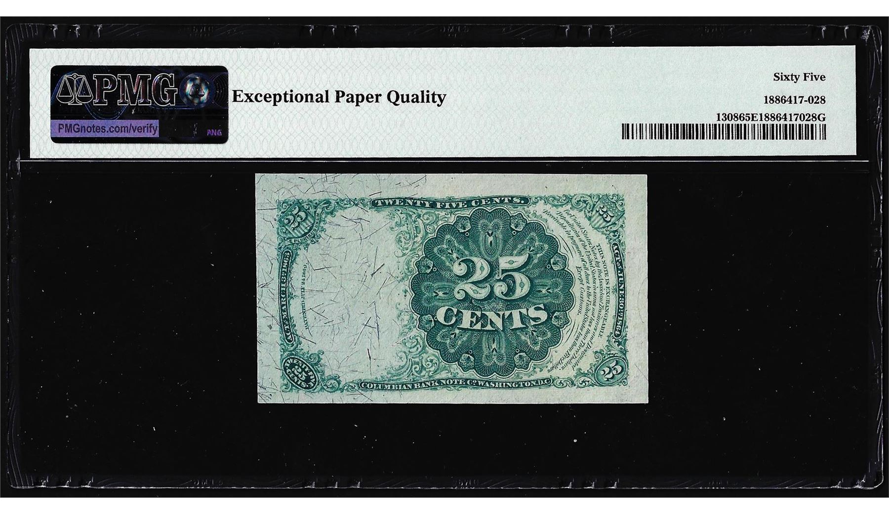 One 1874 25 Cent Fifth Issue Fractional Note Fr.1308 PMG Gem Uncirculated 65EPQ. PMG Certified.