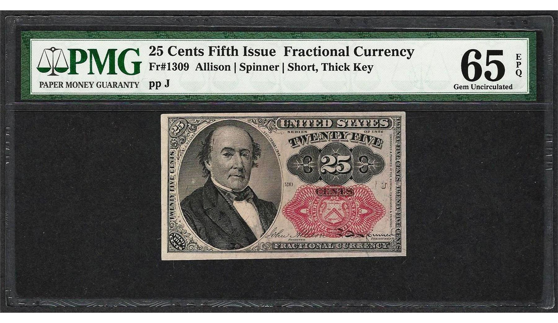 One 1874 25 Cents Fifth Issue Fractional Currency Note Fr.1309 PMG Gem Uncirculated 65EPQ. PMG Certified.