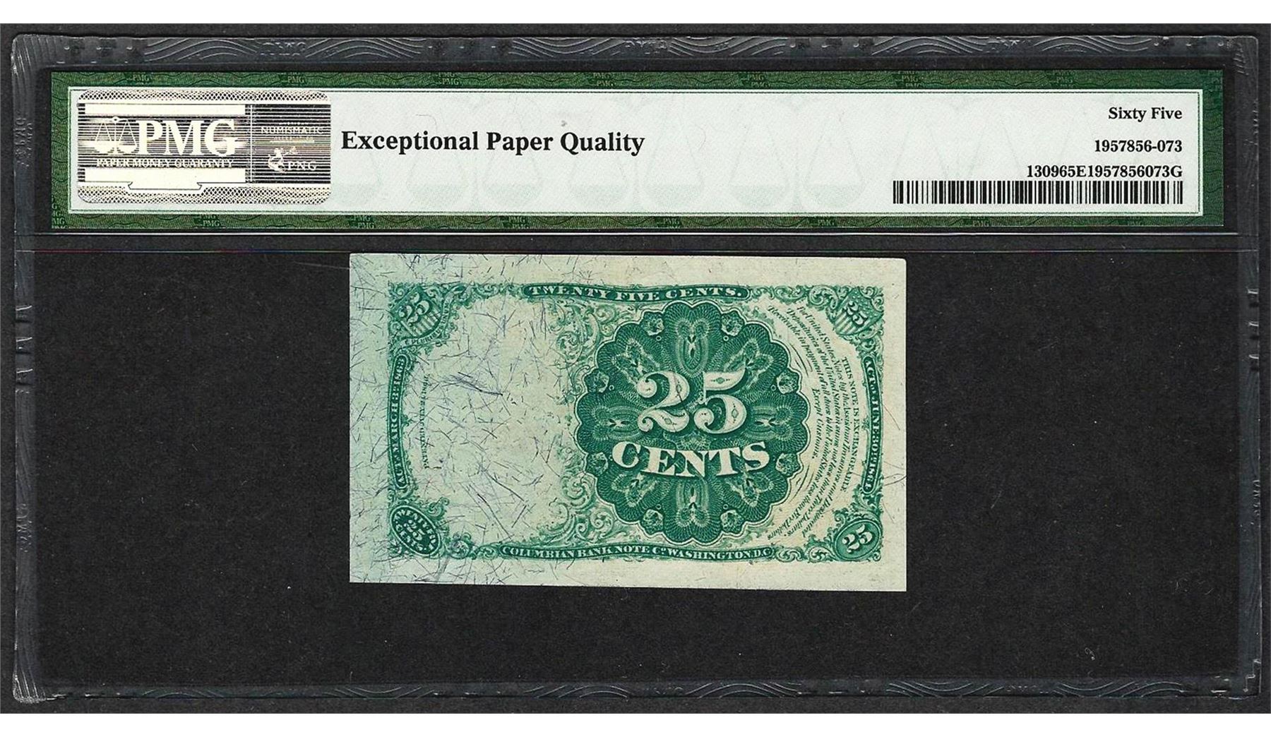 One 1874 25 Cents Fifth Issue Fractional Currency Note Fr.1309 PMG Gem Uncirculated 65EPQ. PMG Certified.