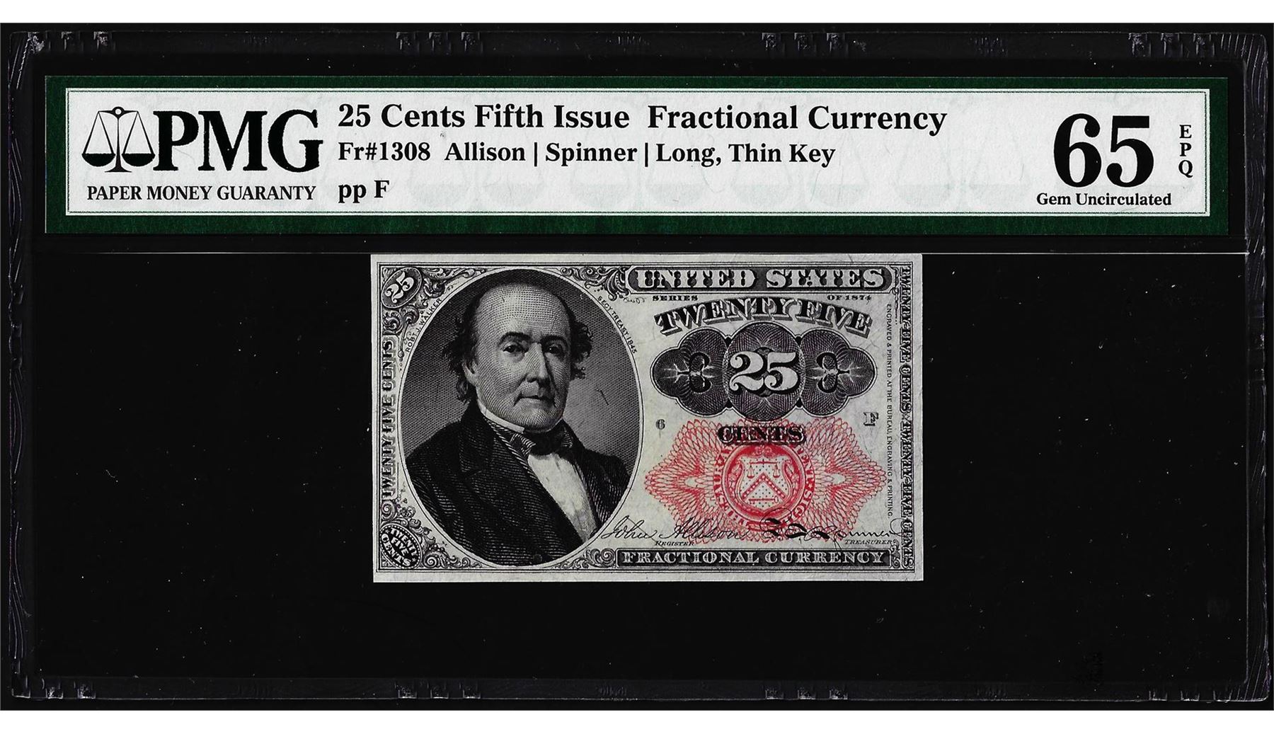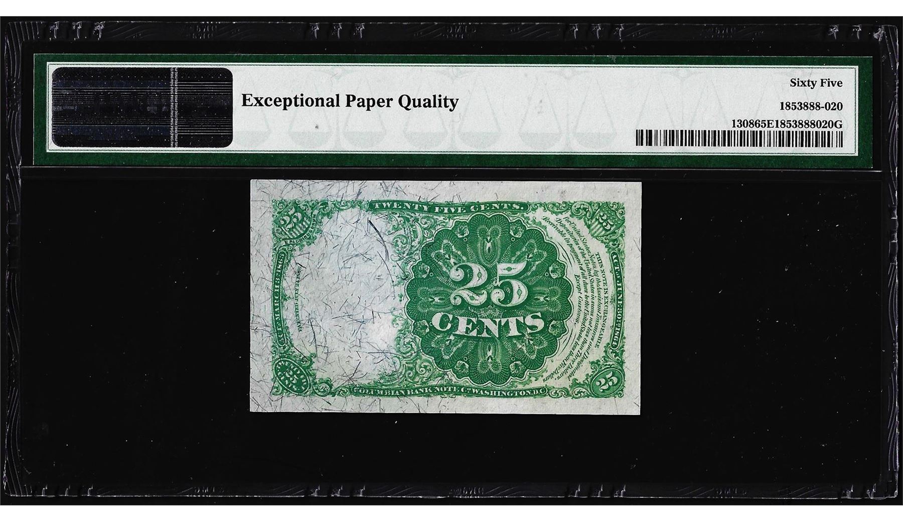 One 1874 25 Cents Fifth Issue Fractional Currency Note Fr.1309 PMG Gem Uncirculated 65EPQ. PMG Certified.